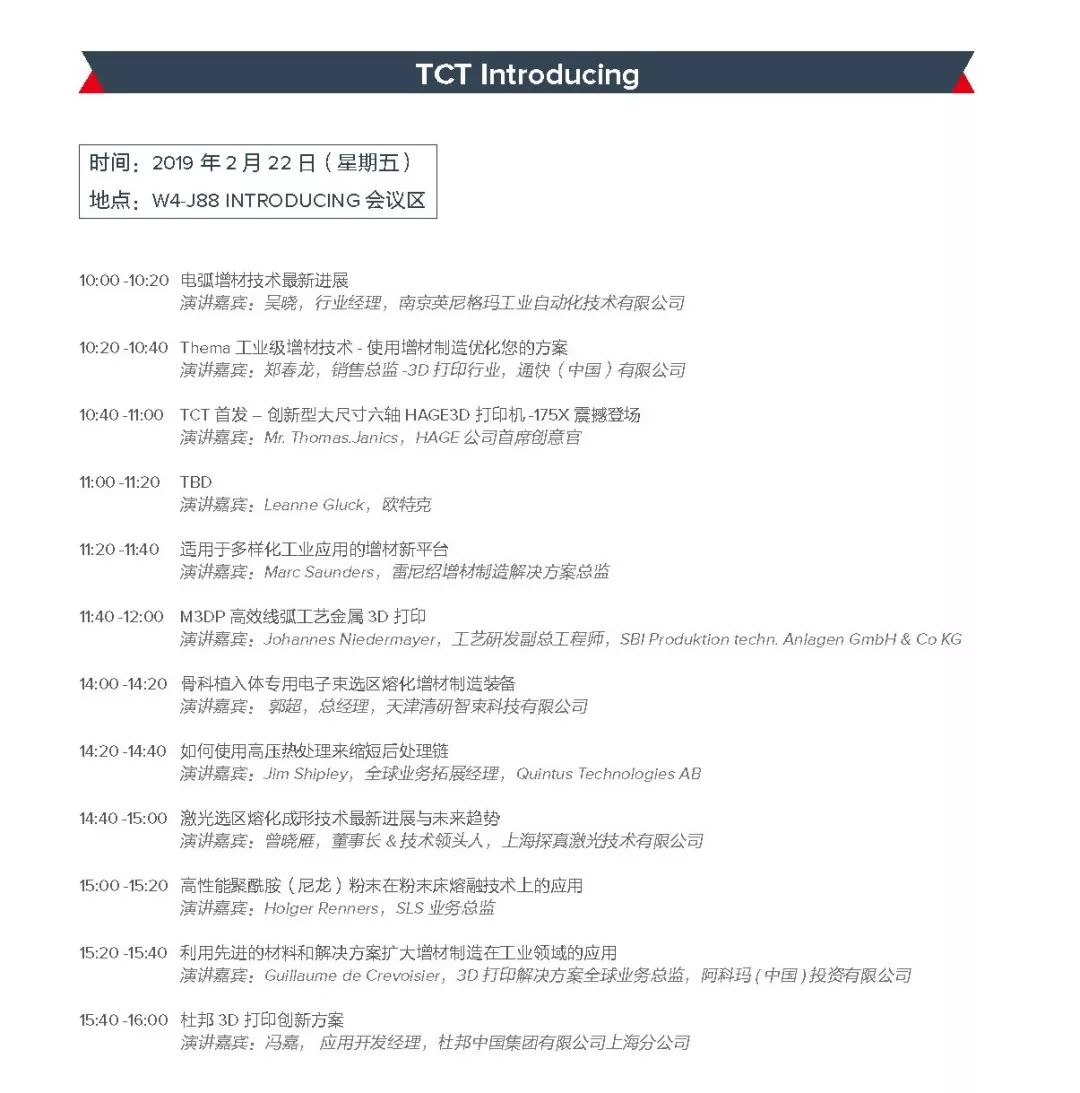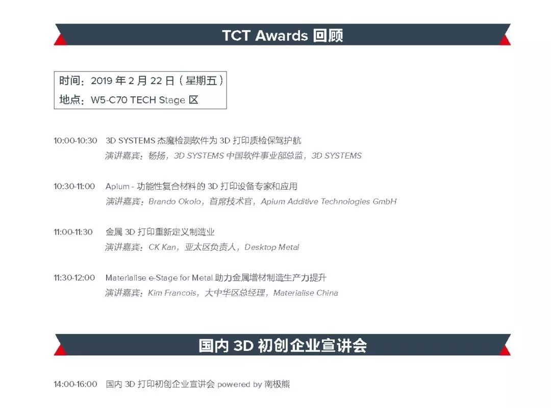 TCT亞洲展同期有包含TCT亞洲峰會(huì)在內(nèi)的超過60場(chǎng)行業(yè)技術(shù)分享會(huì)。TCT亞洲峰會(huì)一直以“應(yīng)用驅(qū)動(dòng)變革”作為其理念進(jìn)行創(chuàng)新,邀請(qǐng)來自各個(gè)行業(yè)的領(lǐng)先應(yīng)用用戶進(jìn)行分享經(jīng)驗(yàn),并形成了航空航天、汽車制造、耐消產(chǎn)品制造和醫(yī)療技術(shù)四個(gè)主要板塊,幫助推進(jìn)各個(gè)行業(yè)的應(yīng)用深化;TECH Stage——包括清華大學(xué)、深圳大學(xué)等研究機(jī)構(gòu)開展的技術(shù)探索;TCT INTRODUCING——圍繞新產(chǎn)品開展的分享交流和用戶溝通。