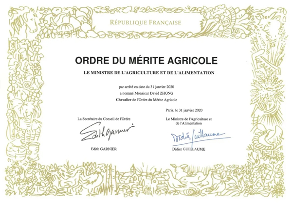 仲剛總裁榮獲 “法國農(nóng)業(yè)功勛騎士勛章”授勛證書
